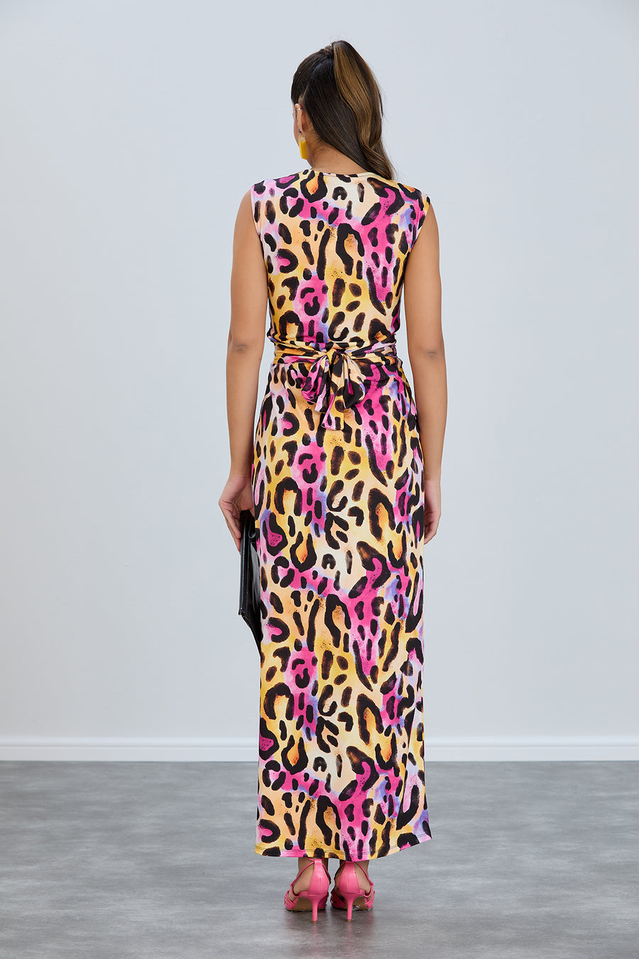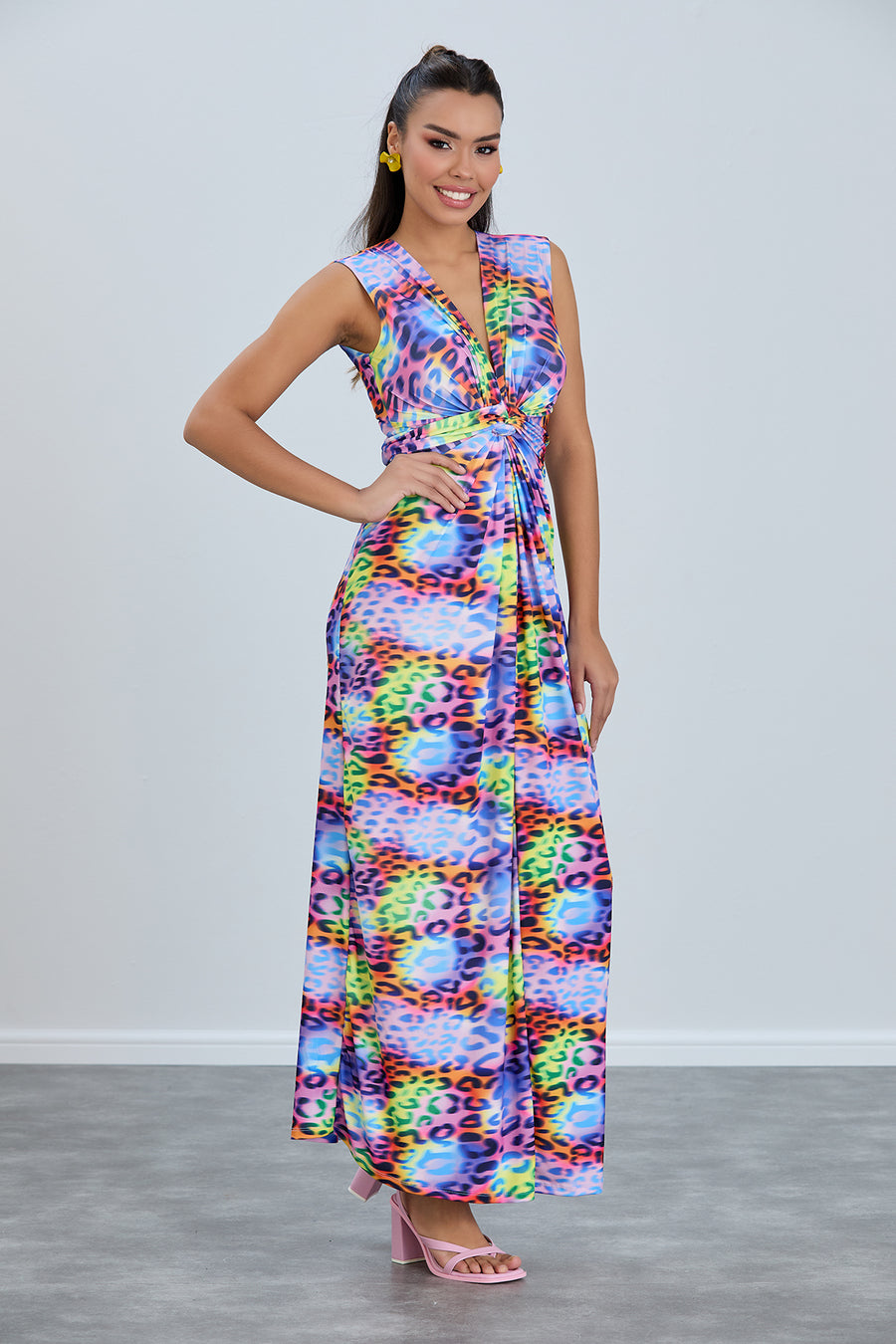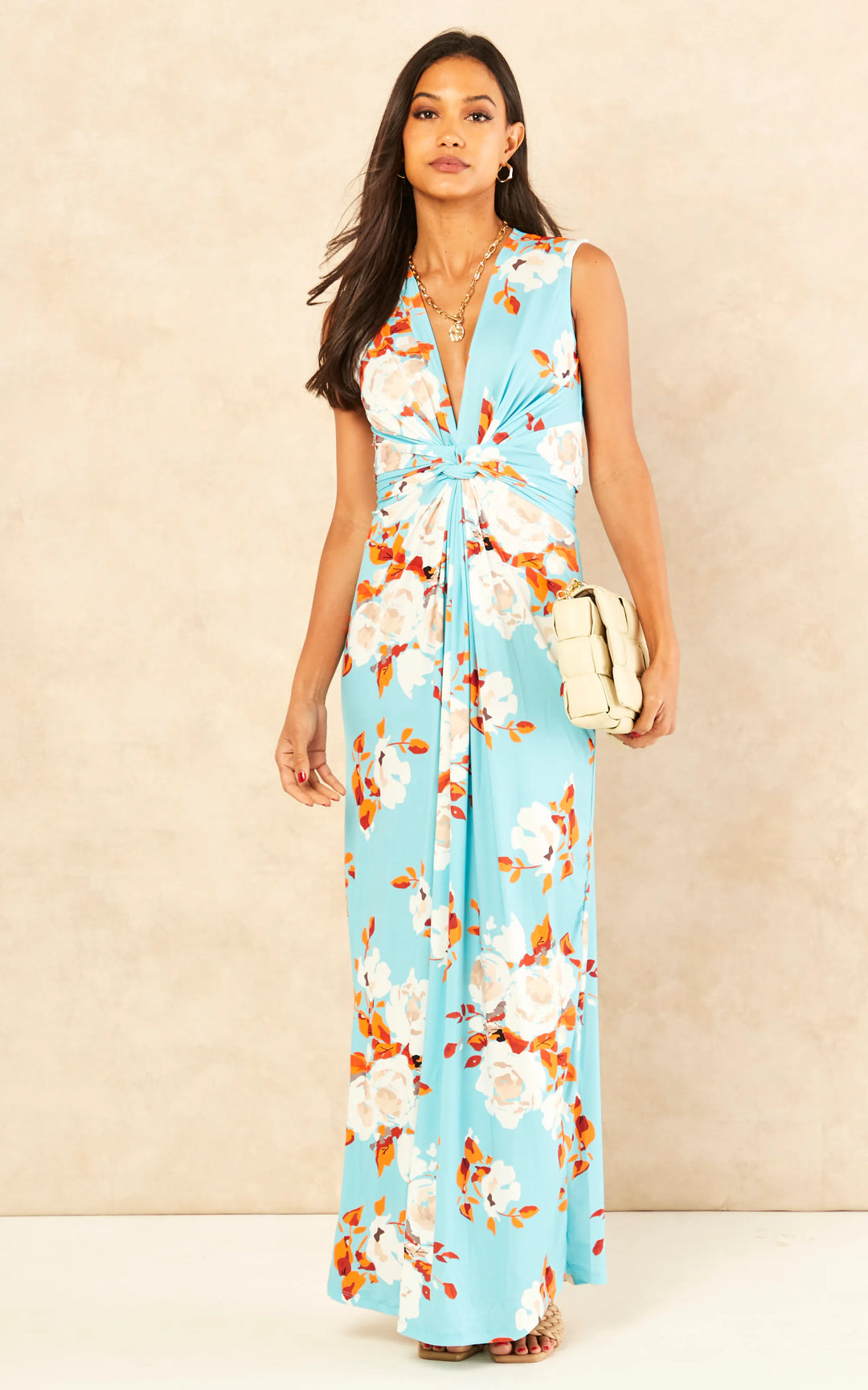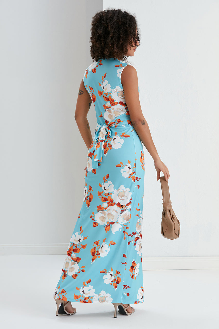V Neck Sleeveless Maxi Wrap Dress in Blue Floral print. Twisted front Maxi Dress made of stretchy material, that has so relaxed fitting. Wrap Detailing at the back.