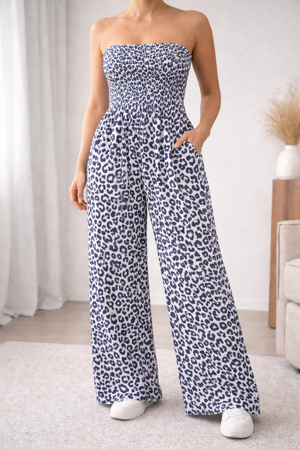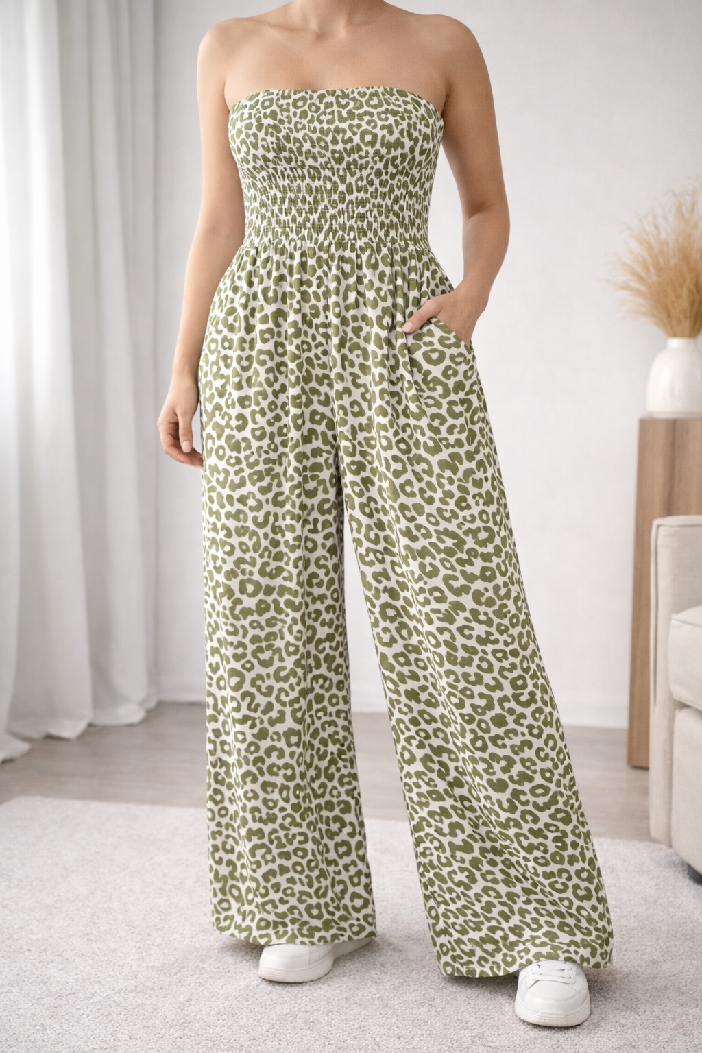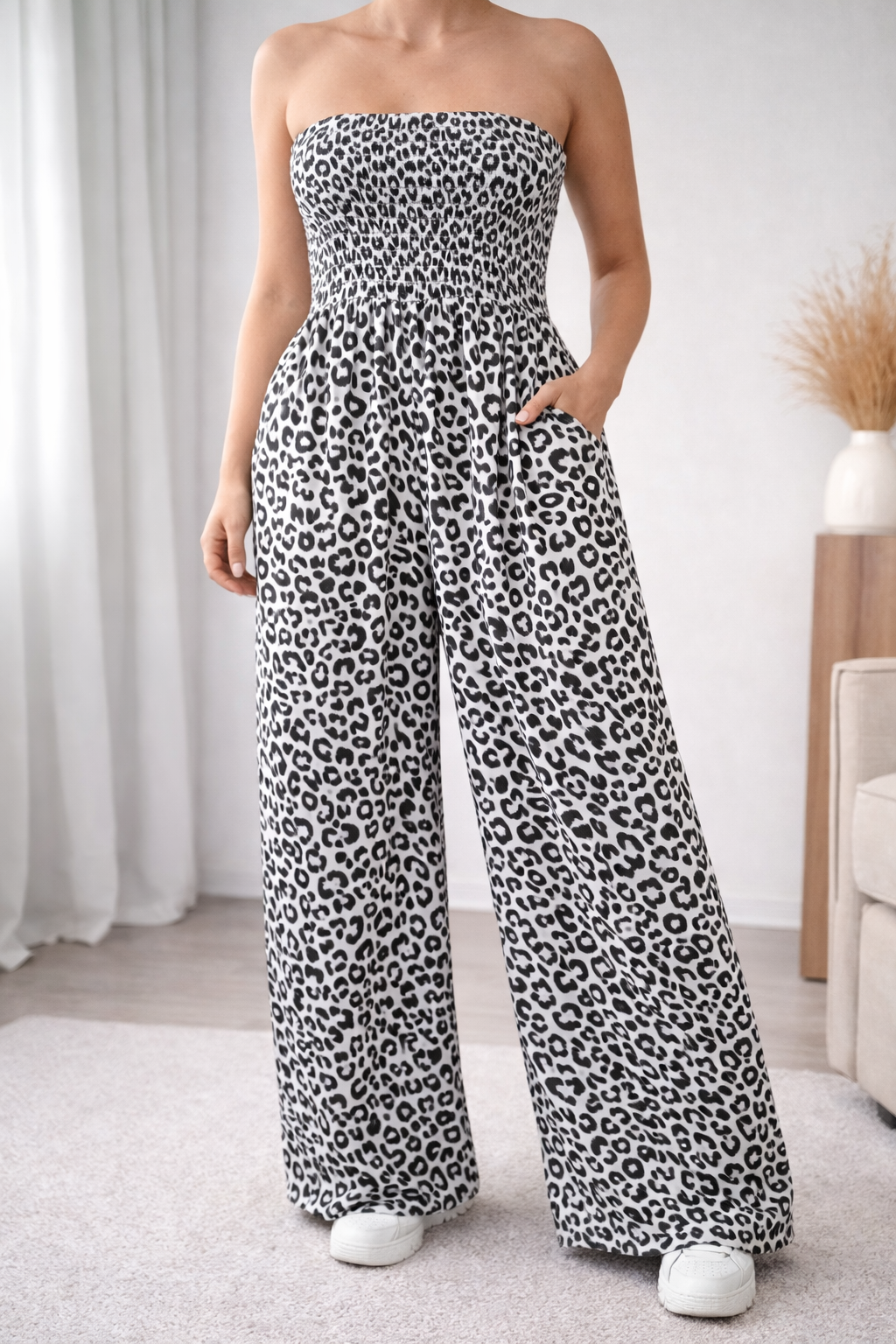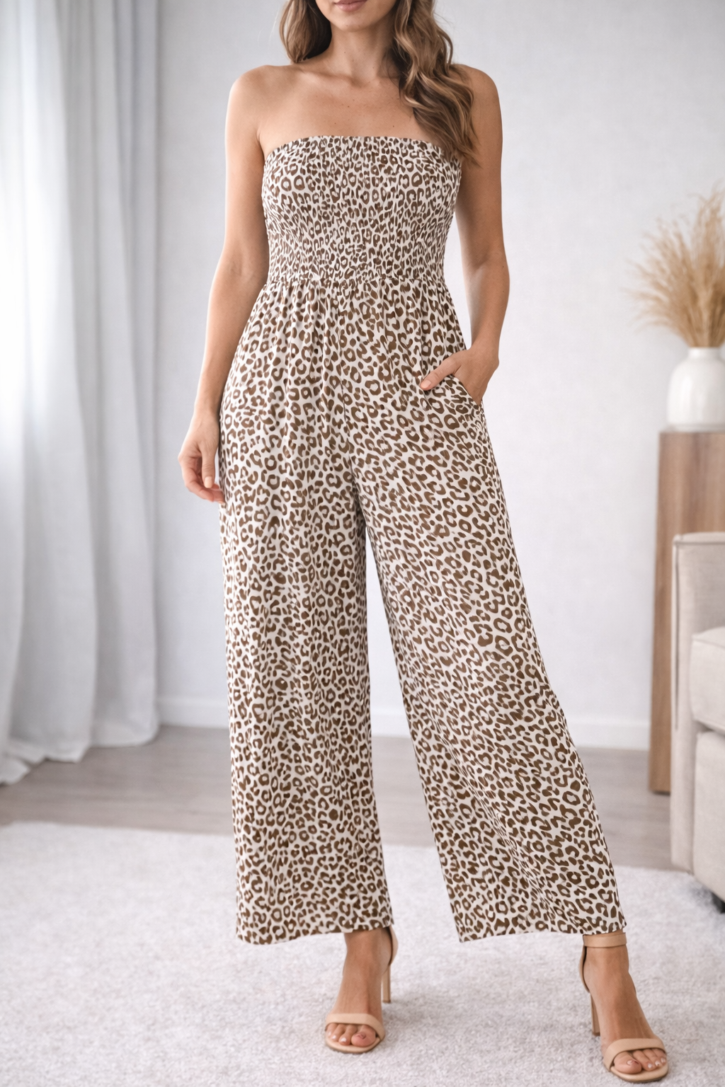 Ruched body jumpsuit with wide leg and pocket detailing