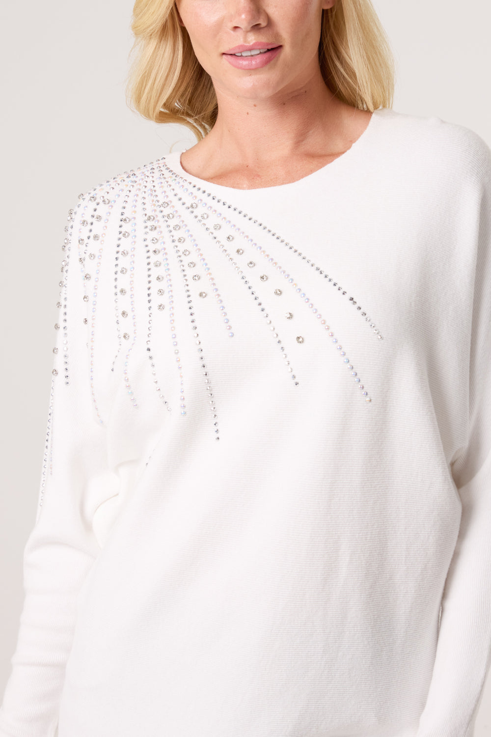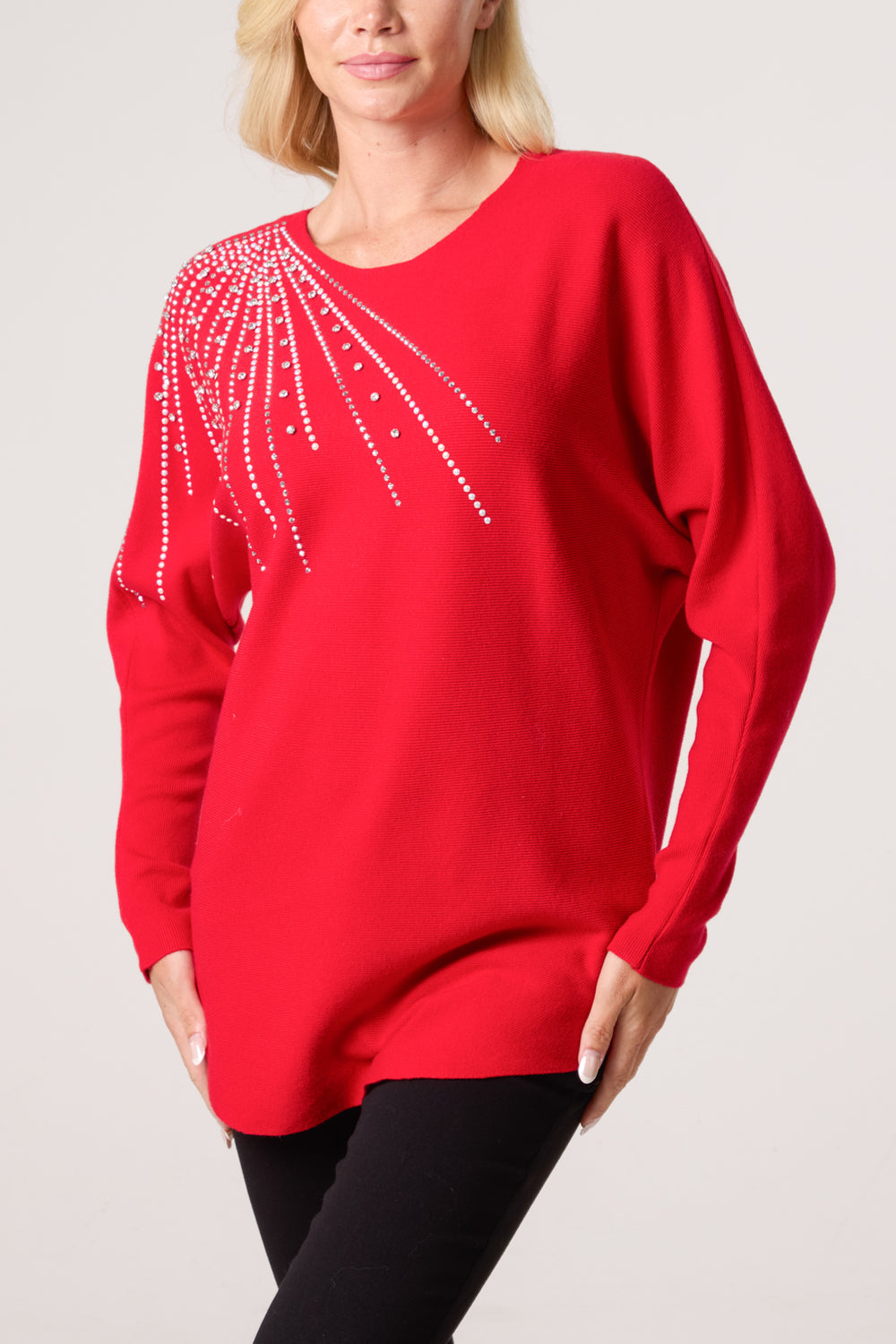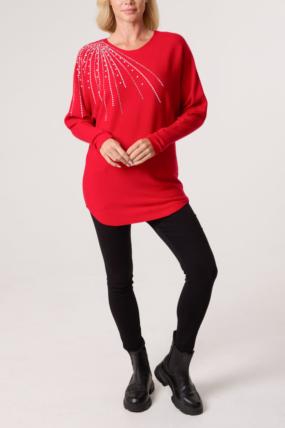 This diamante and stud detailed jumper is sure to become a firm favourite this party season. Team with tights, a PU skirt and ankle boots for the perfect night out outfit or team with leggings or jeans for day to day wear.